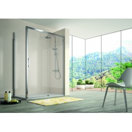 Mampara frontal Kassandra S400 CU102 con hoja fija y puerta corredera. Cristal templado transparente de 6 mm, sin perfil inferior, diseño reversible y perfilería en plata brillo. Altura 195 cm.