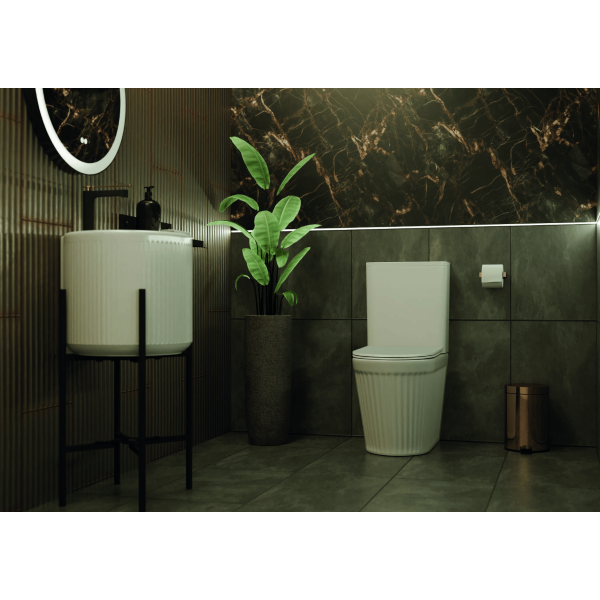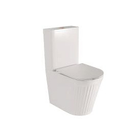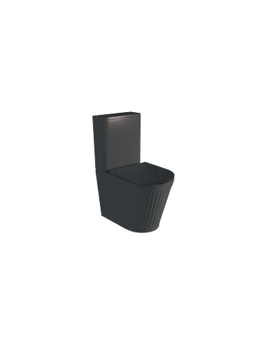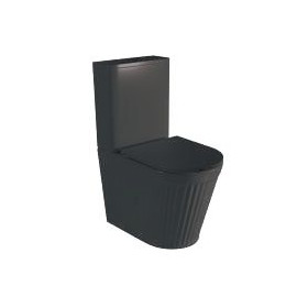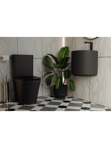 Inodoro de diseño moderno con salida dual. Fabricado en cerámica y disponible en blanco brillo o negro mate. Incluye tapa extrafina de duroplast con cierre amortiguado. Parte de una serie a juego para un baño con estilo uniforme.