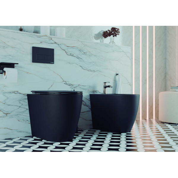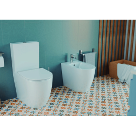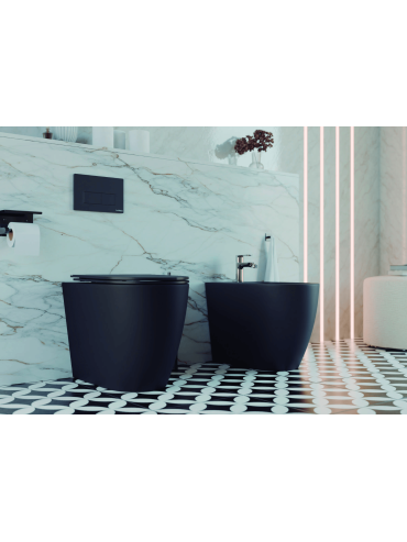 Inodoro de diseño moderno con salida dual. Fabricado en cerámica y disponible en blanco brillo o negro mate. Incluye tapa extrafina de duroplast con cierre amortiguado. Parte de una serie a...