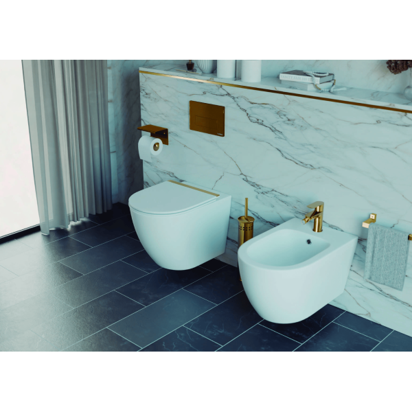 Bidé adosado a pared con diseño moderno, a juego con el inodoro Elba. Disponible en blanco brillo, blanco mate y negro mate. Fabricado en cerámica de alta calidad.