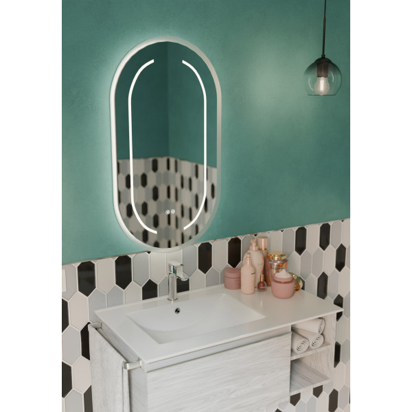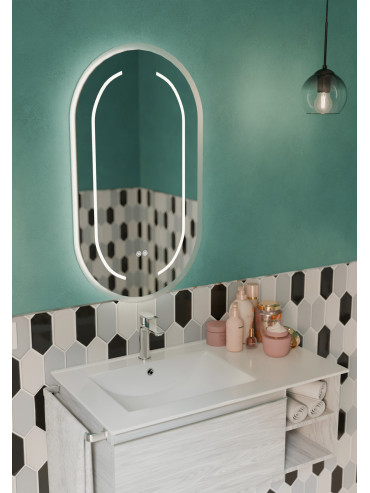 Espejo elíptico con luz LED frontal, intensidad regulable, dos temperaturas de luz y sistema antivaho. Diseño moderno con encendido táctil secuencial. Ideal para baños elegantes y funcionales.