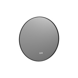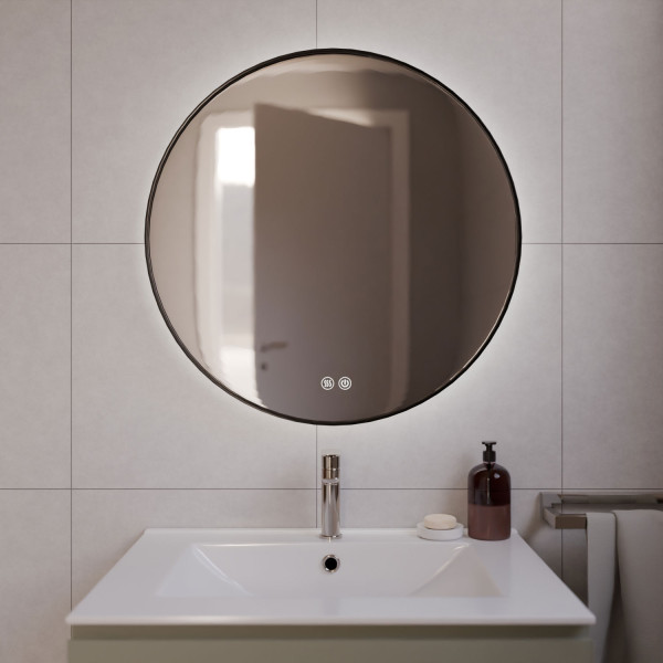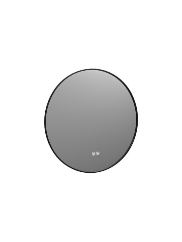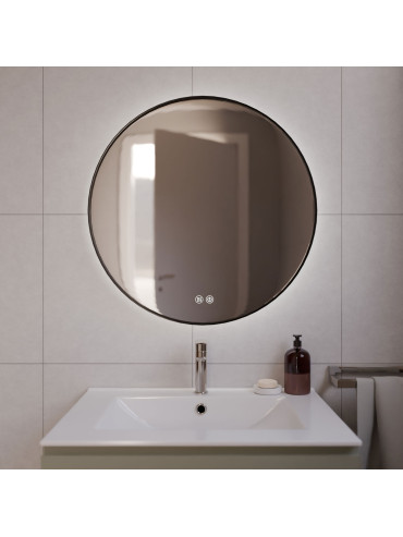 Espejo circular Bari con luz LED integrada y marco de metal negro mate. Disponible en 60 cm y 80 cm de diámetro, con luz táctil regulable y función antivaho. Ideal para baños y dormitorios modernos.