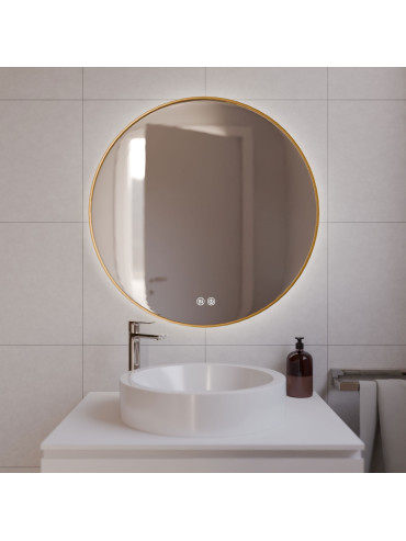Espejo circular con luz LED regulable, tres temperaturas de luz, sistema táctil secuencial y función antivaho. Disponible en acabado dorado o negro mate. Ideal para baños con estilo moderno y elegante.