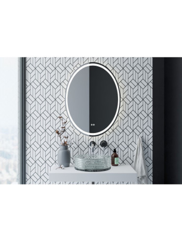 Moderno espejo ovalado con iluminación LED frontal, sistema antivaho y luz regulable en tres temperaturas. Ideal para baños contemporáneos.