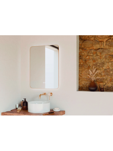 Espejo circular con luz frontal LED, tres temperaturas, intensidad regulable, función antivaho y marco metálico dorado. Un diseño elegante y moderno para baños con estilo.