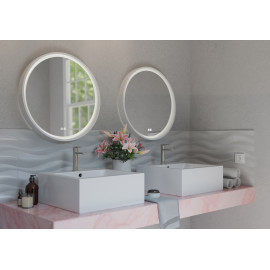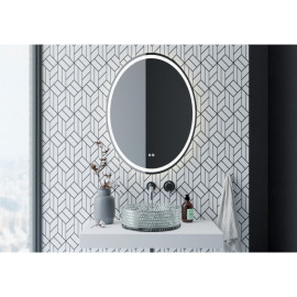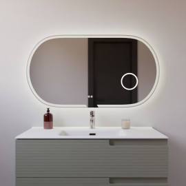 Moderno espejo ovalado con iluminación LED frontal, sistema antivaho y luz regulable en tres temperaturas. Ideal para baños contemporáneos.