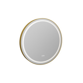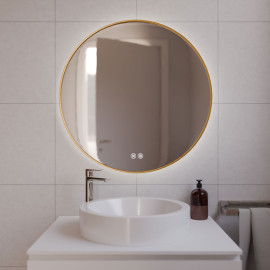 Espejo circular con luz frontal LED, tres temperaturas, intensidad regulable, función antivaho y marco metálico dorado. Un diseño elegante y moderno para baños con estilo.