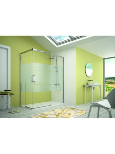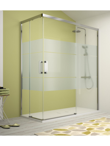 Mampara angular Kassandra S400 CU607 16 + CU607 16 con doble puerta corredera. Cristal templado 6 mm con decorado Clio, sin perfil inferior, altura 195 cm, perfilería plata brillo y diseño reversible.