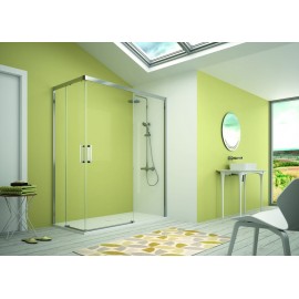 Mampara angular Kassandra S400 con doble puerta corredera. Cristal templado transparente de 6 mm, sin perfil inferior, altura 195 cm, diseño reversible y perfilería en aluminio plata brillo. Ideal para duchas en esquina.