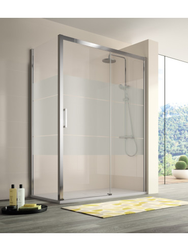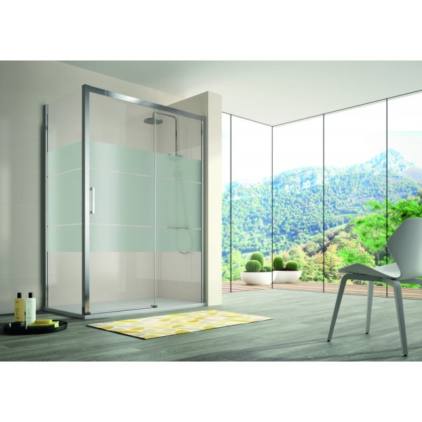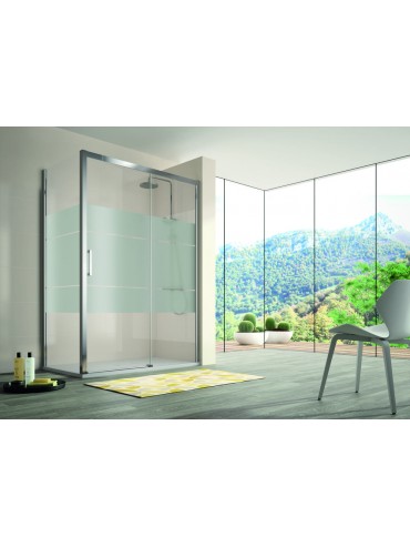 Mampara de ducha frontal Kassandra S400 CU102 con puerta corredera y panel fijo. Cristal templado de 6 mm con decorado Clio, sin perfil inferior y diseño reversible. Altura 195 cm.